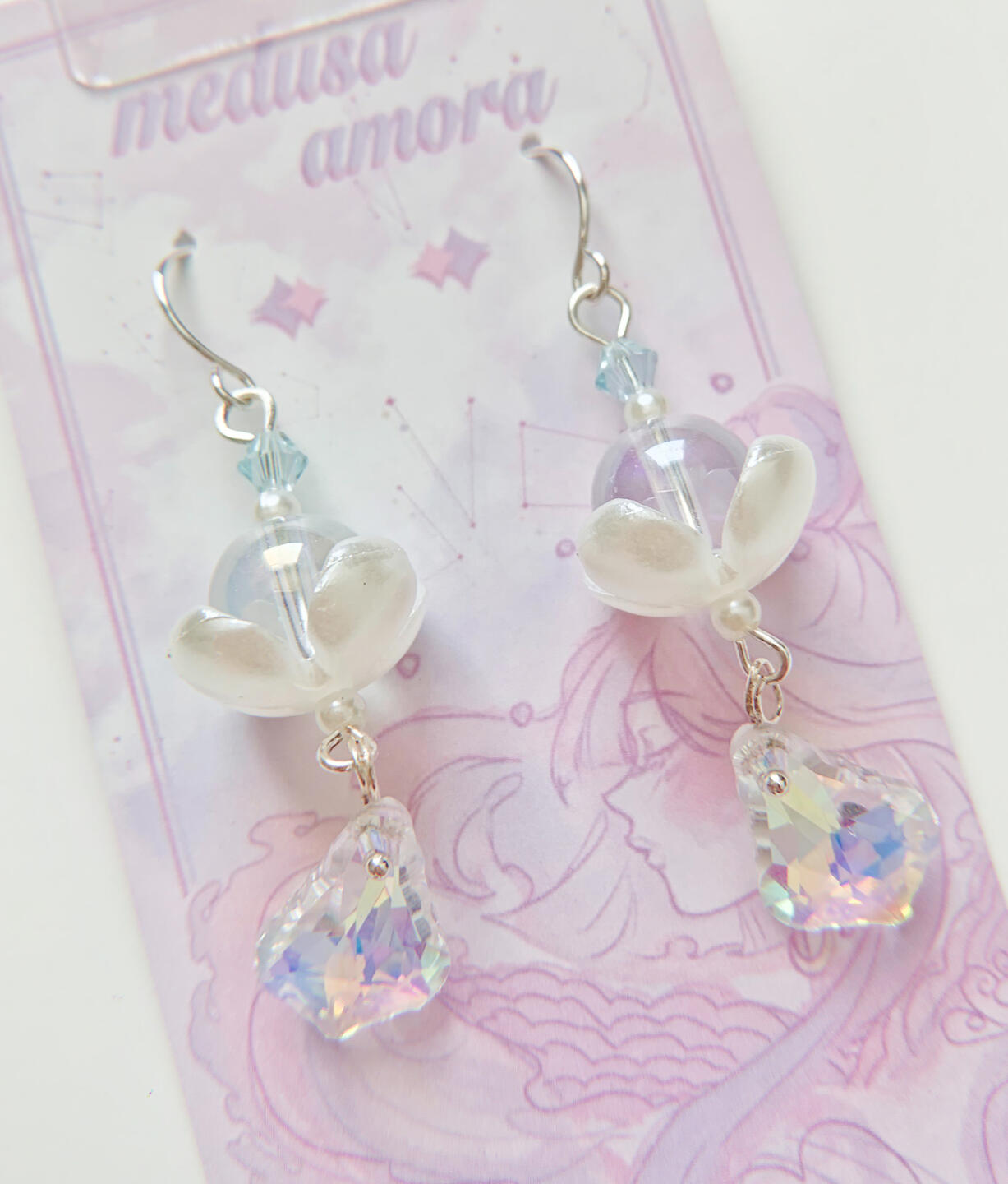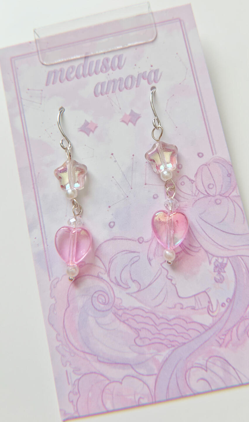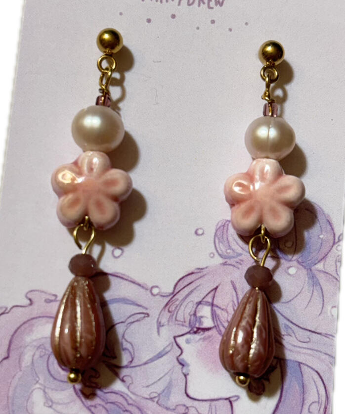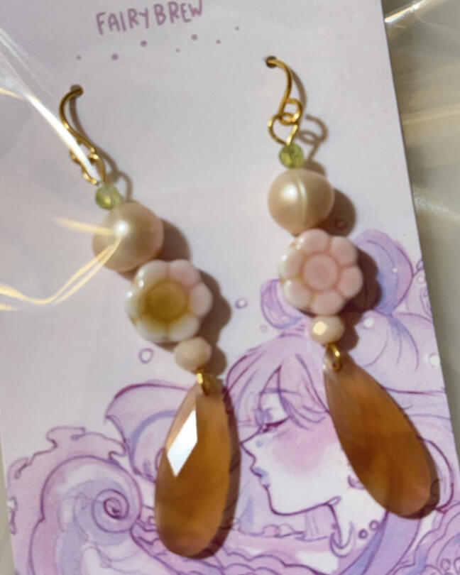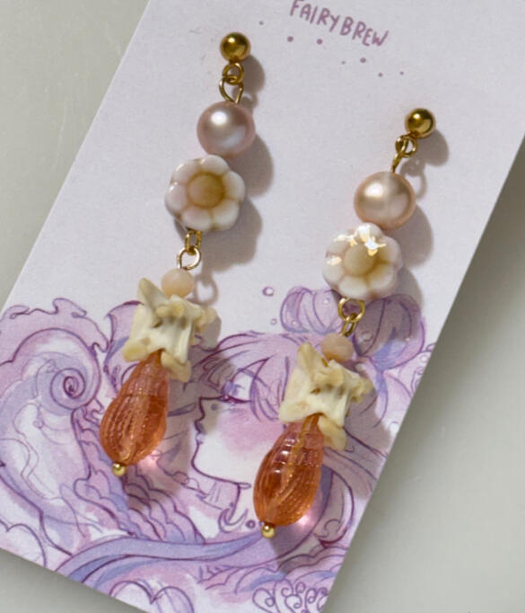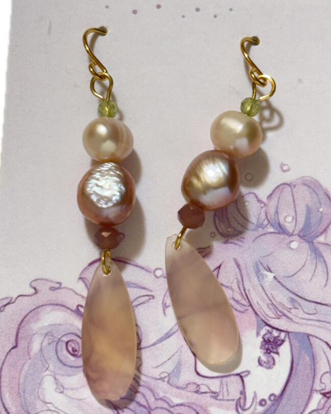 Features: drop earrings made with pink and purple pearls, peridot, tourmaline, and reptile bones.
