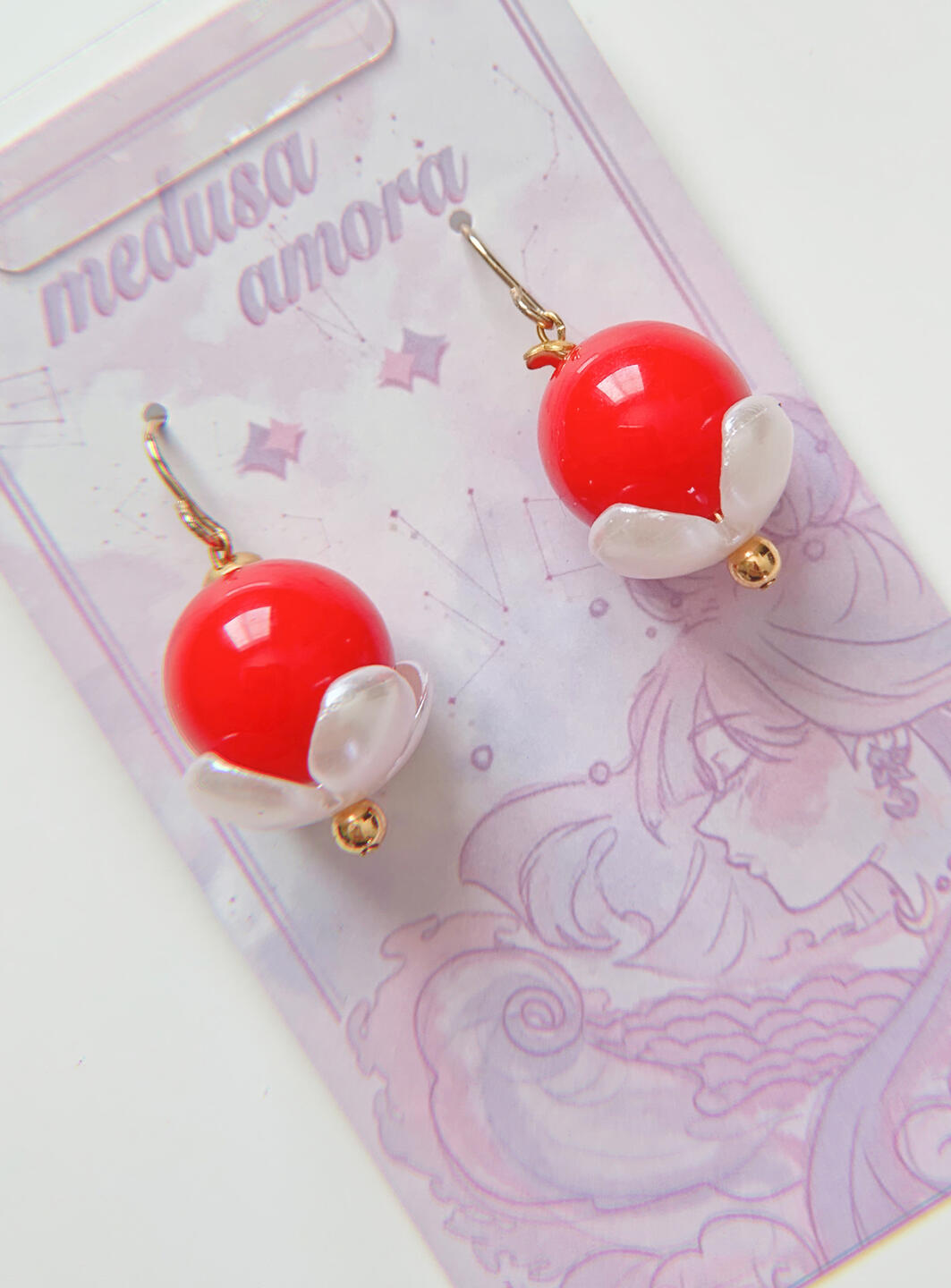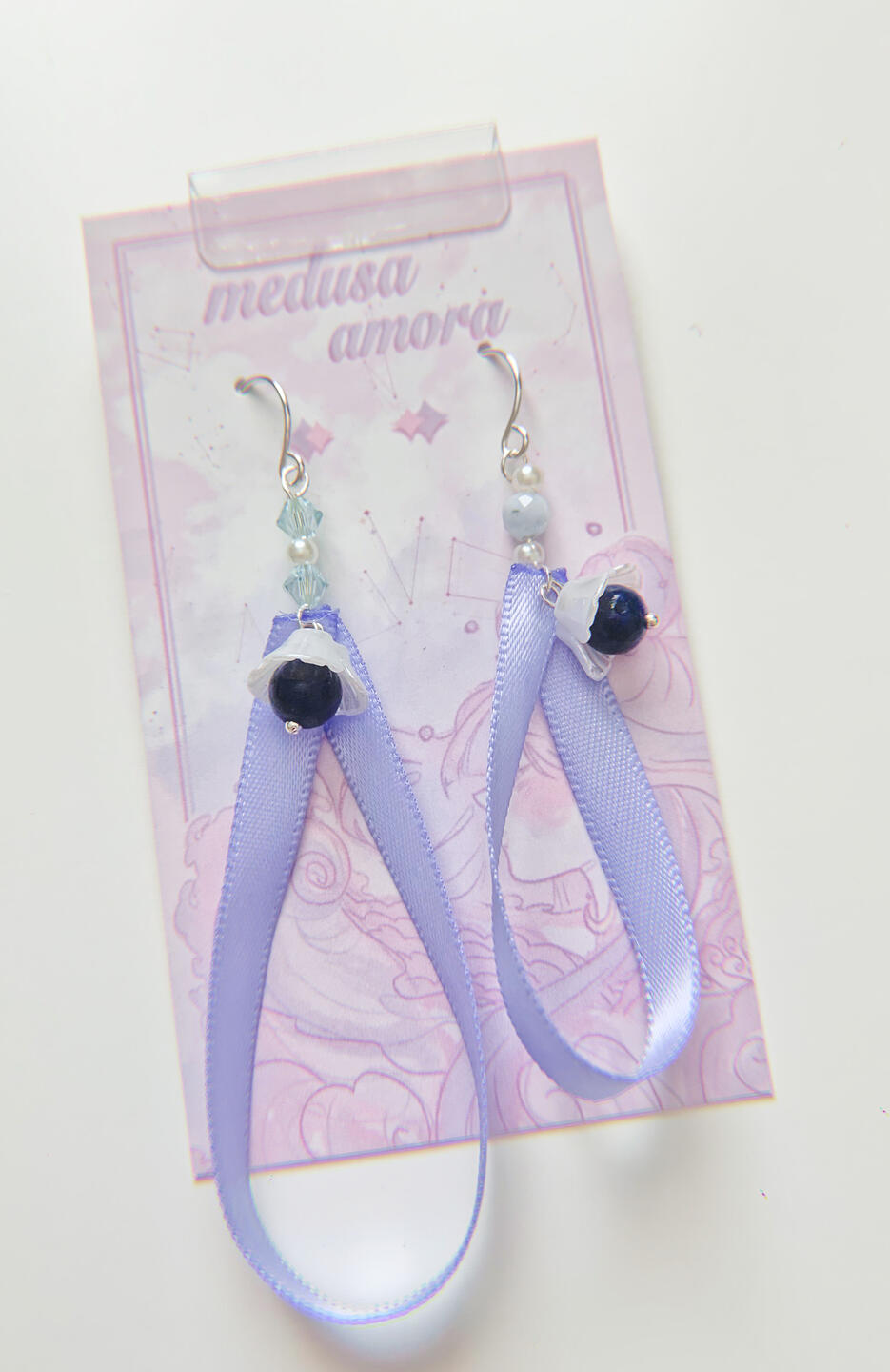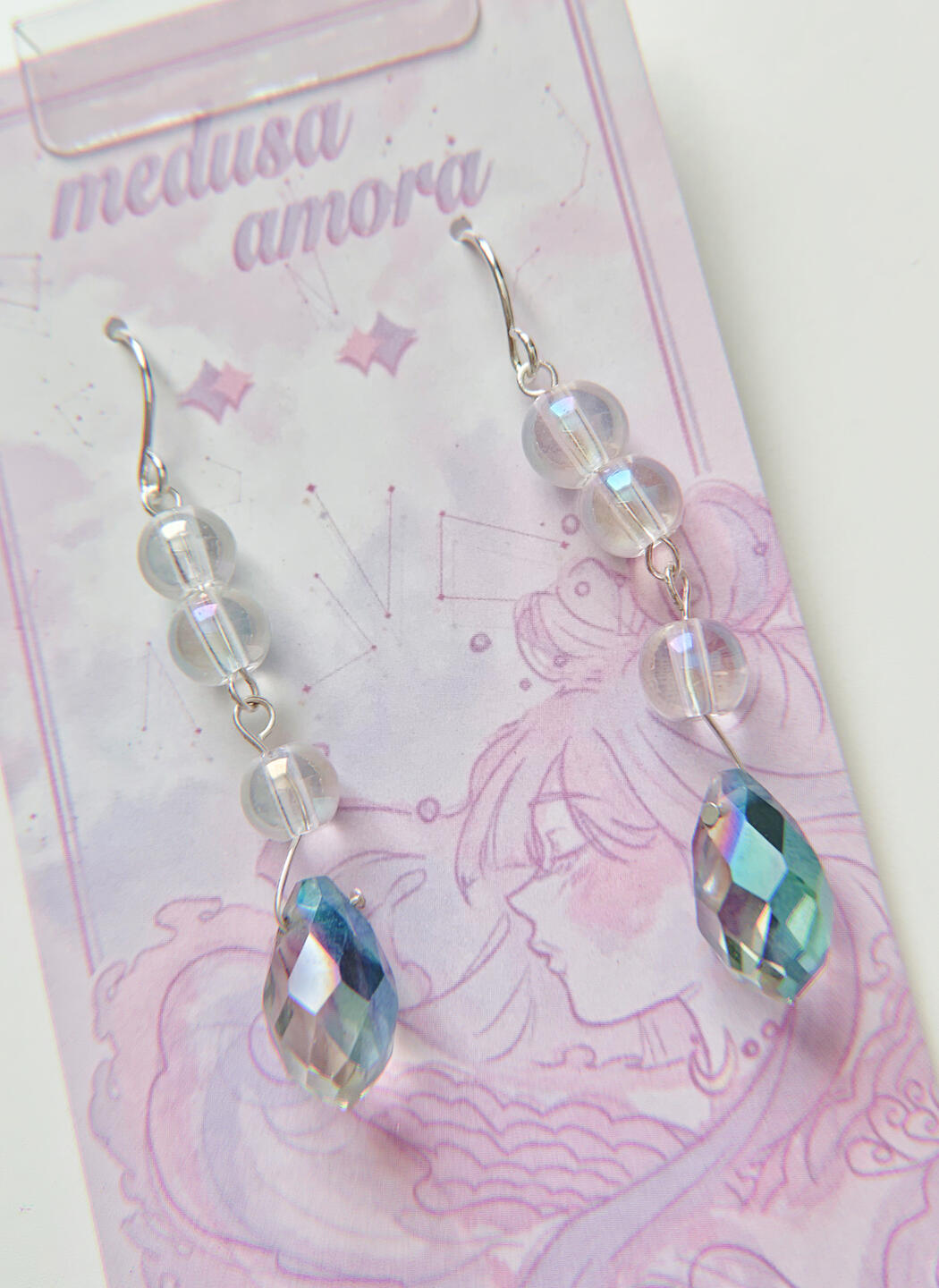 Features: drop earrings made with pink and purple pearls, peridot, tourmaline, and reptile bones.
